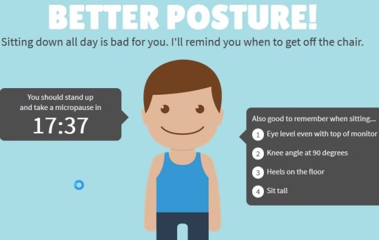 We can all agree to the fact that, we would all love to have healthier daily routines if it was possible. But with our hectic job schedules, its often difficult to accommodate anything else. Our jobs require us to sit in front of the computer the whole day with hardly one or two breaks. Sitting the whole day in your chair can also lead to many health related issues like obesity, back ache, etc. But did you know that even getting up from your chair at regular intervals can help you keep your body in check. Of course taking regular breaks will refresh you also making you more productive. This is where we introduce Better Posture, which is a website which will remind you to get up from your chair and take a break after every 20 minutes.