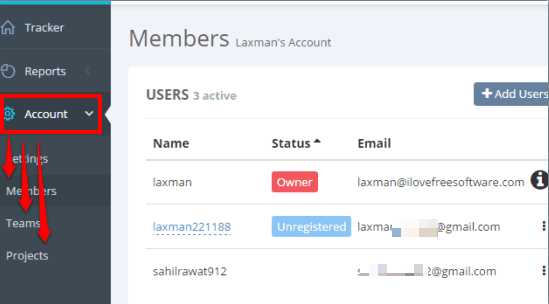 You should first access Account section before accessing Reports or Tracker section. This section lets you create custom teams, add members, and projects to the selected account. The benefit of using this section first is that you will be able to add tasks to a particular project and also sort and track time of users by team and project using Tracker and Report sections later.