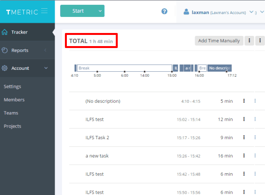 Apart from this, you can also include a break in between the timings of a particular task. List of all the tasks along with their total time and total work time is visible in Tracker section. The list also shows when did you or other member start a task on different timings.