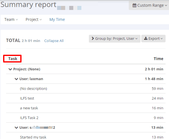 - Summary option: It generates the report in a tree structure. You can explore a project, users worked in that project, and time spent by those users in each individual task.