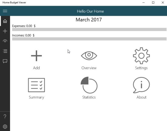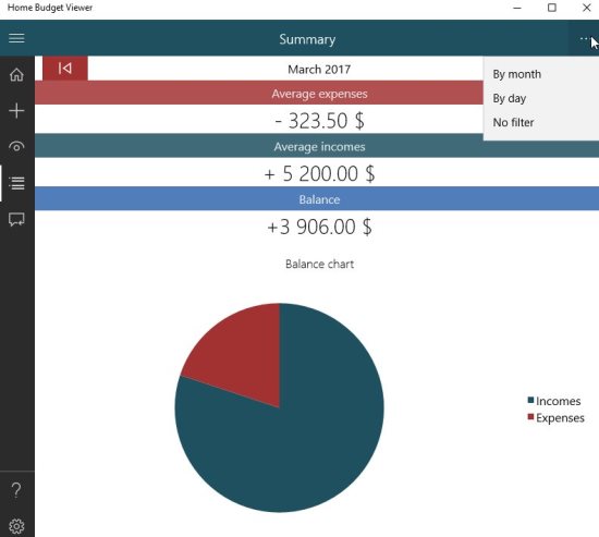 HomeBudgetViewer is a free Windows 10 home budget management app which lets you manage your income and expenses. The app lets you make entries everyday. You can enter the expenses that you make everyday and at the end of the month you can see a summary of what all expenses you made. The app will also show you a pie chart of your income versus your expenditure. You can easily find areas where you can cut your expenses for saving more money.