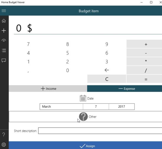 On this screen enter the dollar amount using the calculator. Then select whether it goes in the income column or expense column. Select the date you made this income or expense on. Add a description of this entry so you remember when you refer to it later. After this click the assign button to add this entry.