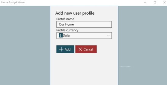 The Windows 10 home budget management app can be downloaded from the Windows 10 store or from the link given at the end of this article. When you start the app you will first be asked to enter a name for your budget and select a currency of your choice. This can be seen in the screenshot below.
