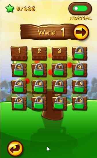 The settings icon on the screen will let you share the game through Facebook, Twitter, etc. The other two options are to turn the sound and music on or off. The play button will take you to the level selection screen as shown in the screenshot below.