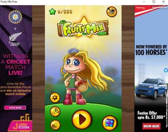 The Windows 10 match 2 game app can be downloaded from the Windows 10 store or from the link given at the end of this article. When you start the app you will see a screen like the one given in the screenshot below. You can see that the app is ad supported and there are ads on both sides of the app. You will feel less distracted by these ads if you play in full screen mode instead of snapped mode.