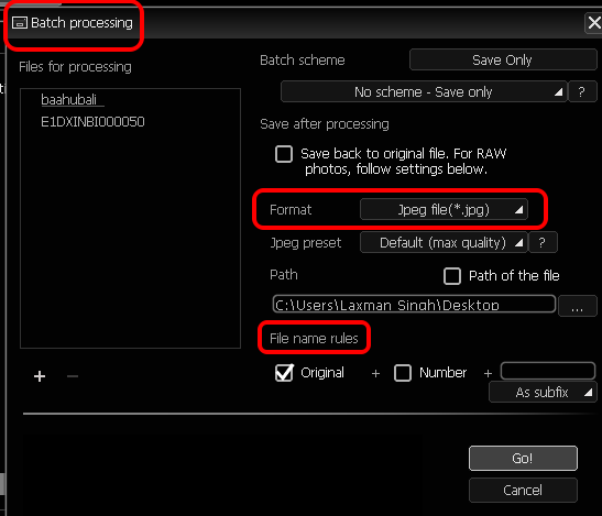 To bulk convert RAW images, select those images, and Batch Processing icon will visible to you. Tap on that icon and a pop-up will open. Using that pop-up, you can select the output type, location, and set the prefix to rename the images. When you have set everything, click on Go! button to process selected images.
