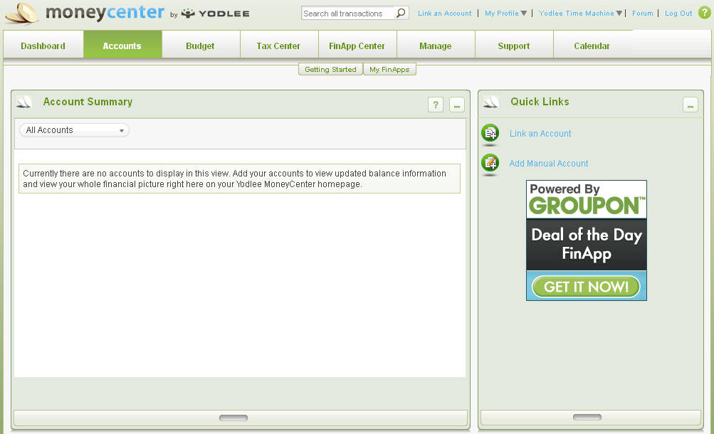 This service from Yodlee is very secure. Information necessary to create an account is extensive, and you will need to remember a lot of it for when you are later on logging into your account. When you do login, the interface that waits for you is shown on the image above. There’s a whole set of different online financial tools that is offered in Yodlee’s Moneycenter and everyone can benefit from using this useful financial web application.