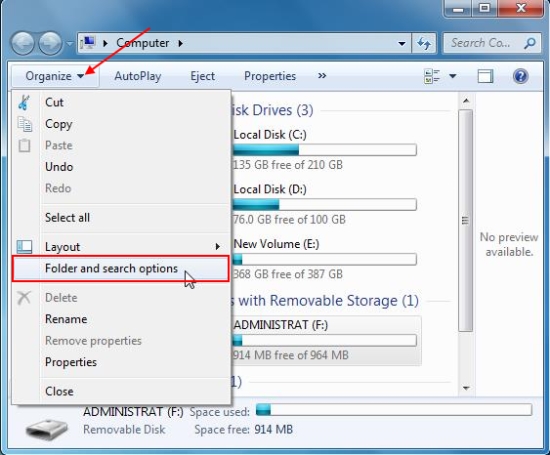 - Click on the “Organize” menu on the top-left corner of the window and select “Folder and Search Options”.