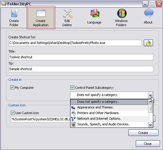 The “Create Application” tab lets you add programs (.exe files) to My Computer and Control Panel by creating shortcuts for them. This can be done by simply browsing application you want to create shortcut for, specifying a name for it, associating a custom icon with it, and finally pressing “Create” button. A shortcut for that program will then appear in My Computer or Control Panel or both, whichever you specify.