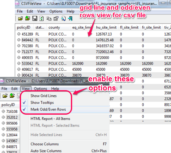 Screenshot above shows a sample csv file opened by me on its interface, with grid lines and odd/even rows activated.