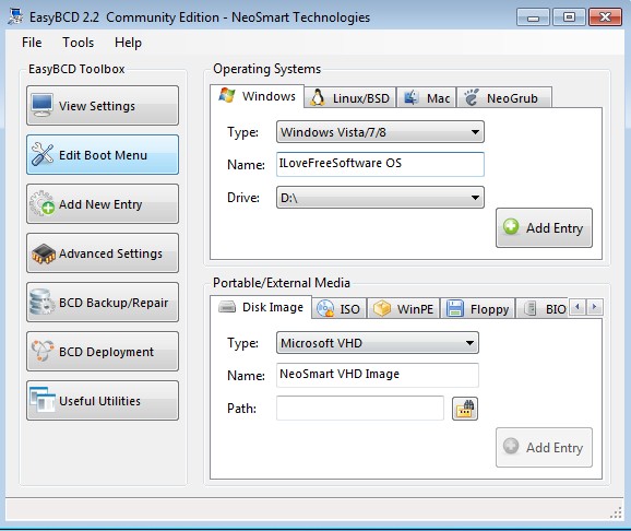 EasyBCD is a free Windows bootloader editor which you can use to edit/change Windows bootloader and manage it when you have multiple operating systems installed, more precisely when you dual boot Windows with Linux, BSD, Mac or a different version of Windows. EasyBCD also allows you to boot into older versions of Windows like MS-DOS, ME and Windows 2000, which aren’t supported by bootloaders that newer versions of Windows have.