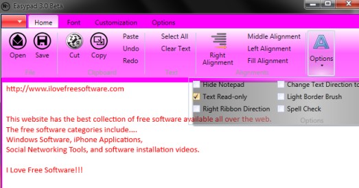 The most important tab in this text editor is home tab. It provides all needed options such as: open or save a file, set text alignment (right, left, center), hide notepad, make text read only (no one can edit or cut text), enable/disable spell checker, etc.