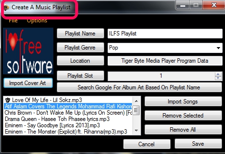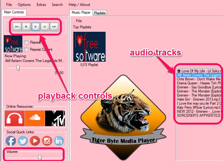 Tiger Byte Music Player helps to import multiple audio files from PC to its interface. File menu is used to import songs and create playlists. Apart from this, some basic controls (play, pause, next, previous) along with volume slider will be available to manage songs.