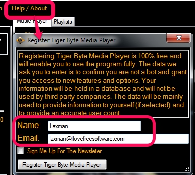 Get this free media player using the download link present at the end of this review. Its zip file is 2.08 MB in size which you need to extract into a folder to run its setup file. After installing it, open it and register your product for free. Access Help/About option and register the product with your name and email id.