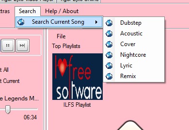 Some more options will be available in this music player that help to access radio player, search current song’s different versions (see the screenshot below) online with your default web browser. It shows results using YouTube or Google search engine. You can select any one using Settings.