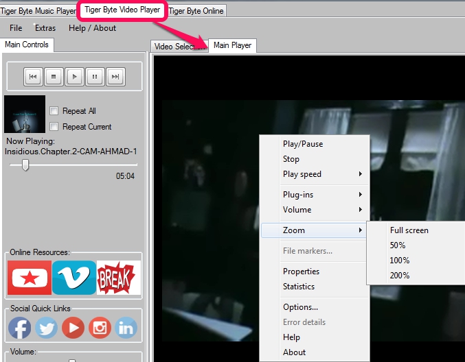 Tiger Byte Video Player is useful to add supported video files to play. Just like its music player, this video player helps to create multiple playlists of video tracks of your choice. Same basic playback controls will be available to use. Moreover, right-clicking on playing video will let you adjust playing speed, access properties of video, zoom video screen, etc.