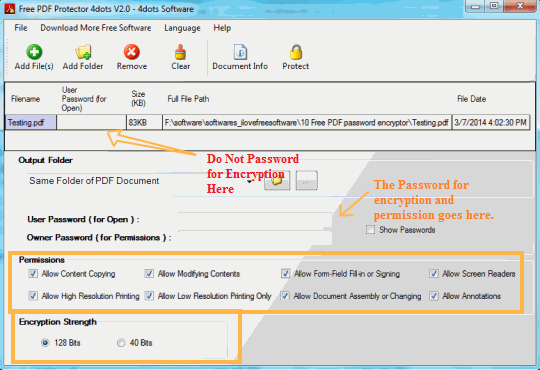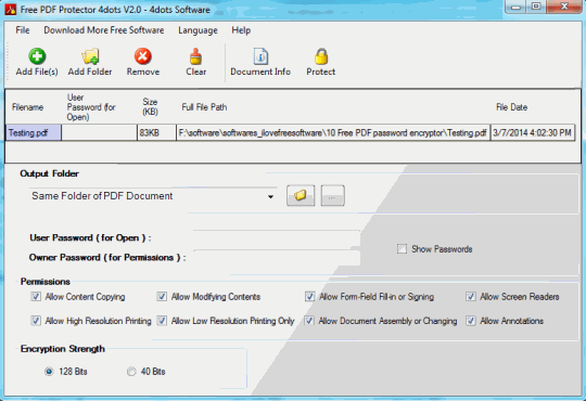 Free PDF Protector 4 dots is a free software which can be used to password protect PDF and add restrictions (permissions) to a PDF file. You can password protect a single PDF, or batch password protect multiple PDF files. In addition to that, it also adds an option to right click context menu, so that you can just right click on a PDF file and password protect it!