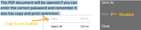 Once encrypted, a new window will open up with the location given for output files, you can now access the file to check if they have password protection and restrictions or not. I encrypted a PDF and imposed restrictions on content copying and printing. I got the following results.