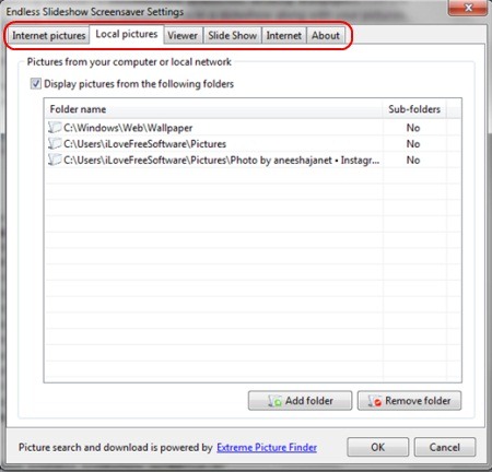 Then clicking on the local pictures tab, you can add the folder you want the pictures to be taken for the slideshow.