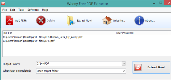 This is also a great PDF image extractor software in this list. What makes it special is that it can also fetch all the text from your PDF files. So, it works as both PDF image and text extractor. Another interesting feature is that it can also extract font used in a particular PDF file. All these three tasks are done automatically which is simply great. You can insert multiple PDF files and it will automatically extract images, create text file and font file of that PDF.