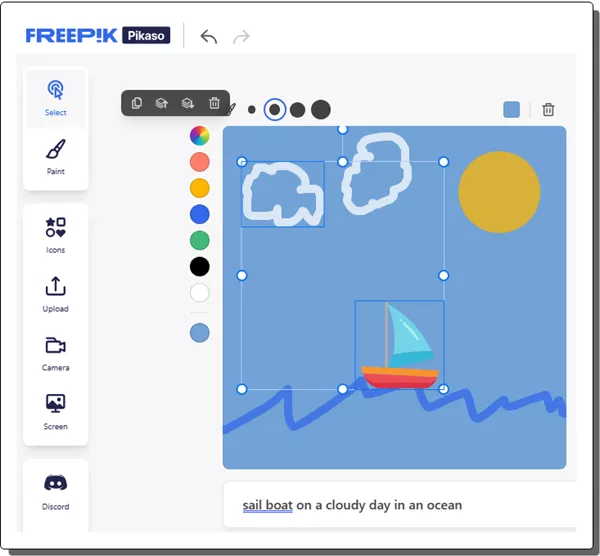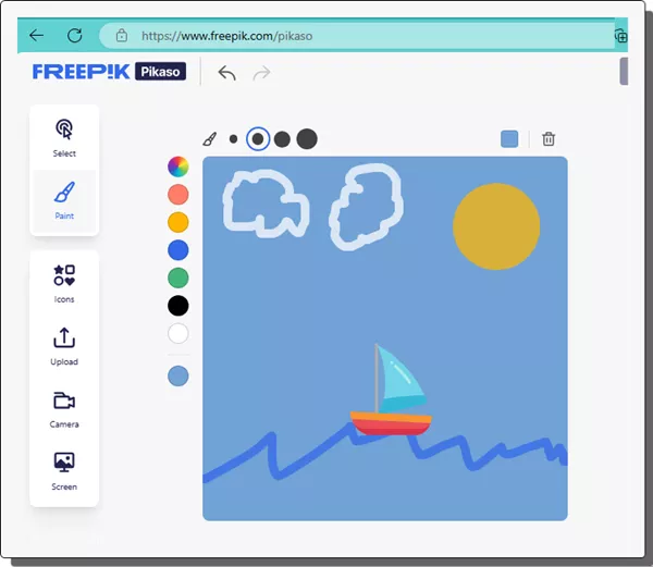 - All the tools are in the sidebar. You can change the brush width from the top and choose other tools from the sidebar. For example, you can choose the Freepik resources to add objects in your sketch such as boat, animals, house, ocean, building, etc.