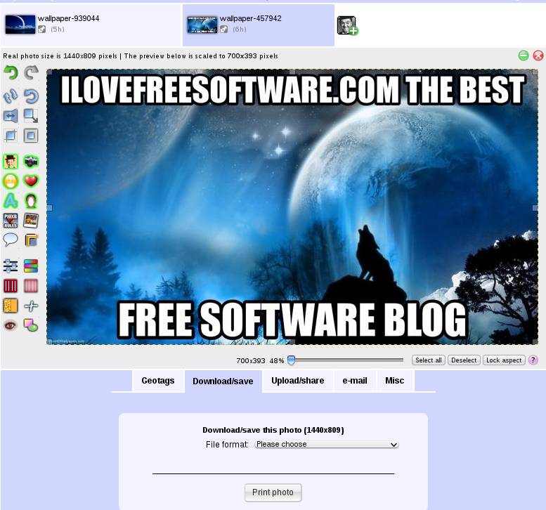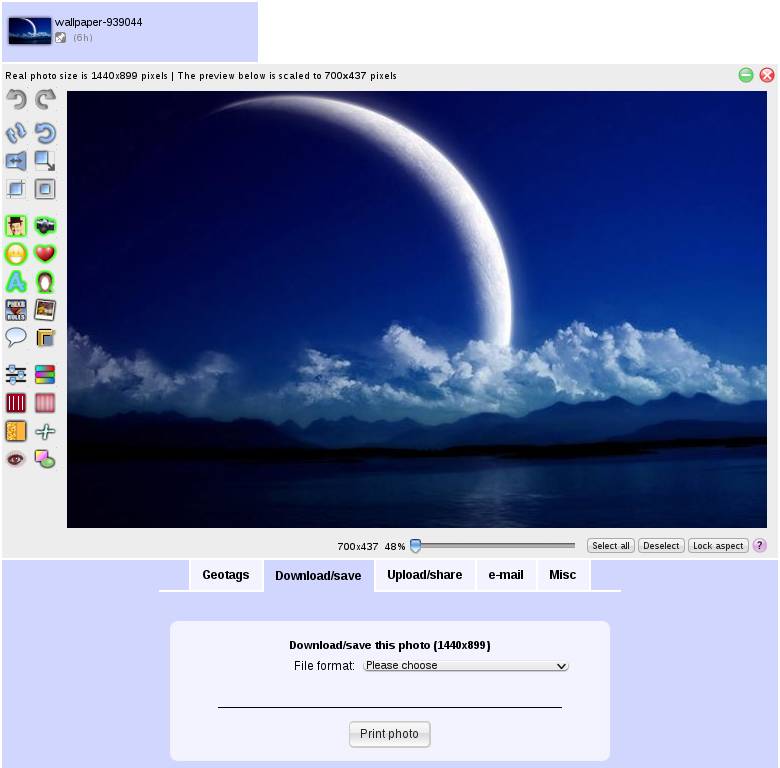 You can add meme(a type of text) to images, and a lot of other useful tools are available, like for example frames, collages, Instagram effects, and so on. When you’re done, photos can be downloaded to a computer or uploaded to image hosts directly from Phixr.