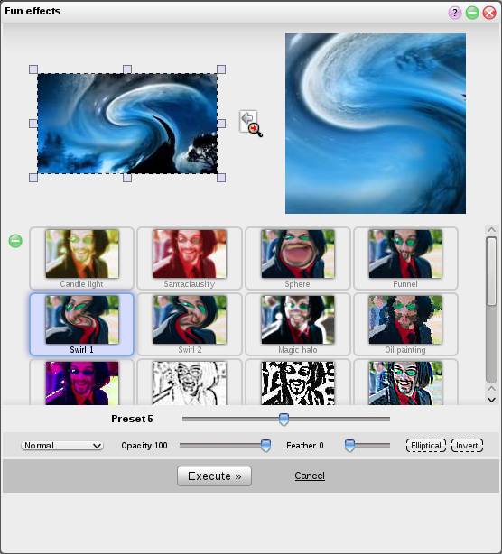 Fun effects tool can be seen in the image above. It comes with a live preview so you can sample effects to see how they will look like before applying them with Execute button.