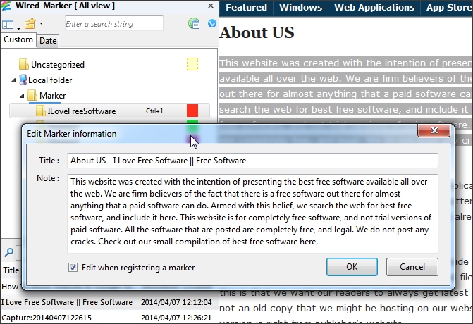 Wired Marker is a free Firefox extension that lets you highlight and bookmark important text on webpages. This extension adds a sidebar to your Firefox browser. You simply need to select the text you want to bookmark, and drag the text to the sidebar of this extension. The text will be bookmarked.
