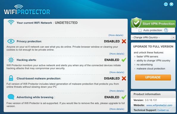 Not all of the service that you can see on the screenshot down below are available in the free version of this wireless protection software. Malware protection for example is not available, and you also cannot choose which country the VPN that you’re connecting to is gonna be. Free version is also ad supported, you can see a full list of benefits that you get by upgrading in the right sidebar.