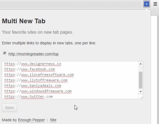 Multi New Tab is a Chrome Extension which lets you open multiple websites in new tab window of the browser. What this extension does is it lets you store multiple website links and every time you open a new tab in your Chrome browser a random website from the list of stored websites will be opened for you.