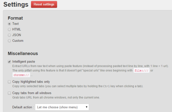 Apart from this, you can also use Paste option using its extension icon to automatically open all the URLs as separate tabs. By default, it copies URLs in plain text form, but you can access Settings page to adjust the options.