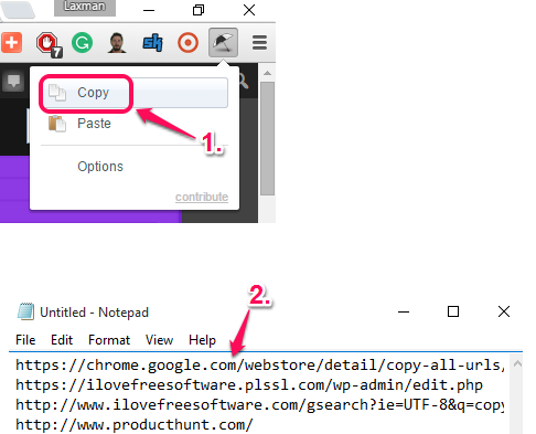 After the installation, you can copy URLs of all opened tabs using its extension icon (available at top right corner). Now you can paste all the URLs in Notepad or any text editor.