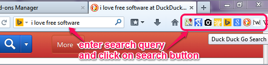 The Other Search (or The Other Add On) is a handy Firefox extension that helps to search information with different search engines. It simply adds buttons for most commonly used and popular search engines on Navigation Toolbar to find the result of a query. Thus, you don’t have to use default drop down menu to first select a search engine and then use Search button. It provides buttons for Google search, Google maps, Bing, Thesaurus search, Google Images, DuckDuckGo, Google Scholar Search, Wiktionary Search, and Wikipedia Search.