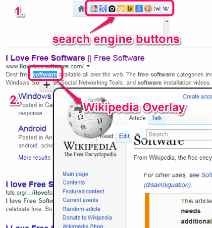 Screenshot above shows search engines button and Wikipedia Overlay provided by this free Firefox add-on.