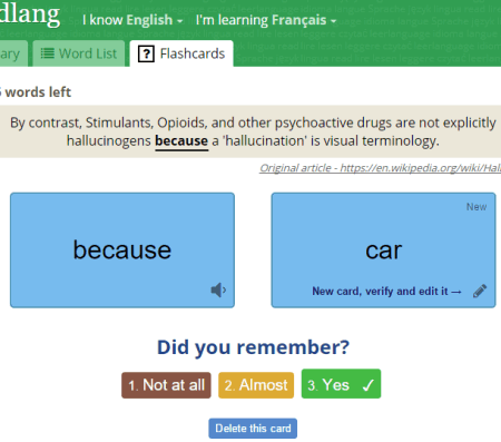 When you are done with translating, you can use the same pop-up to access Review Flashcards option. It will direct you to your Readlang account and generate the flashcards for you. Now you can play with those flashcards and try your best to memorize those words.