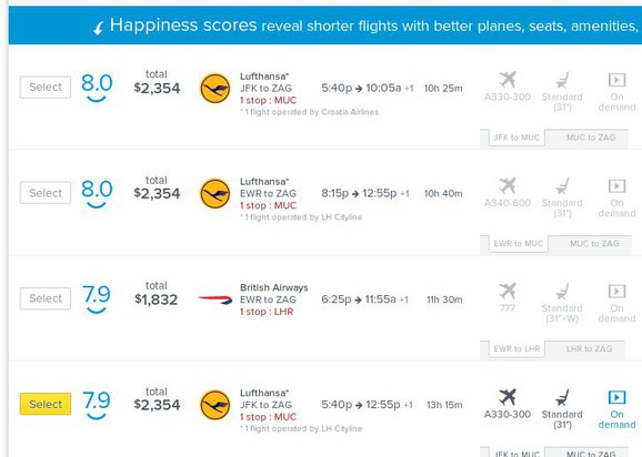 Once you’ve filled out everything and clicked on Search, you’ll have to wait for a few seconds for RouteHappy to gather information for the flight route that you’ve entered. It doesn’t take too long, and very soon you’re gonna be presented with a list of airplane companies,flight prices, lay overs (if there are any), and all the other flight info that we mentioned is available.