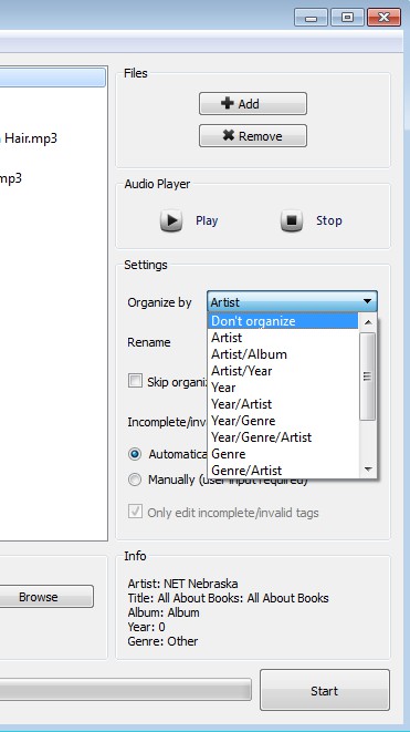 Second step requires you to select how you want selected songs organized. By artist name, album name, year of release, etc. If you don’t want to, you don’t have to organize MP3s, there’s a “Only Edit ID3 tag information” check mark that you can put so that only ID3 tag info changes are applied. When you’re done, set the output directory and click Start. ID3 tag information of the songs is gonna be changed and they are also gonna be organized and sorted into folders if you decided to do so.