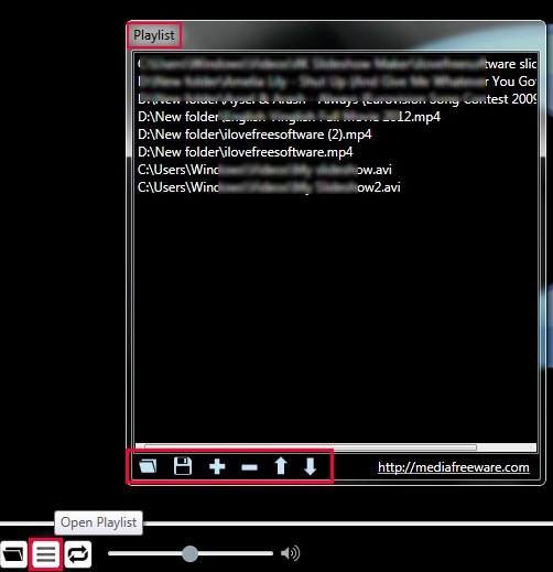 In between playback controls and volume slider, there is a button present ‘Open playlist’ (as highlighted in below screenshot) which is used to open playlist window. On that playlist window, you can add multiple video files, can arrange positions of added videos, and can save them as a playlist file to desired location on your PC. Add as much videos as you want and save them. And if any video is added to your playlist by mistake, then you can remove it using ‘– button’.