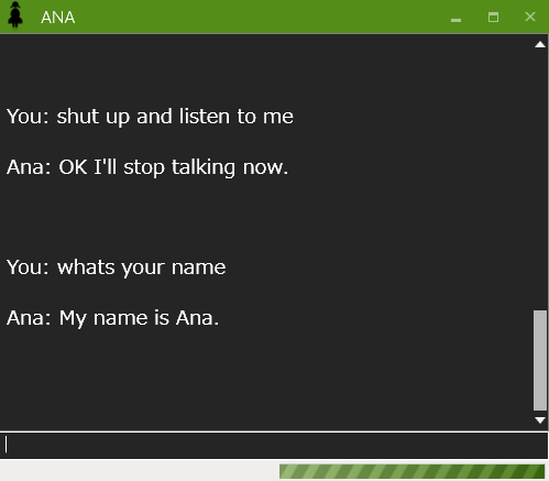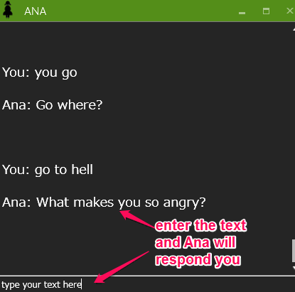 After opening the interface, you can chat with a bot named ‘Ana’. No Internet connectivity is required to use it. Use the text box available at the bottom part and type the text. As soon as text is posted by you, it will reply immediately. Along with text reply, it will also speak the reply.
