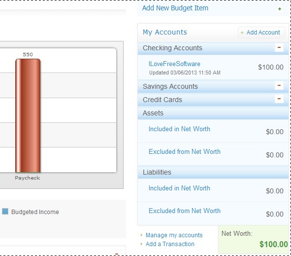 Budget is of course only for creating the monthly budget, but you can also create various different accounts where money’s gonna be saved or from where it’s gonna be paid, credit card account, checking and so on. You’re not actually connecting to your bank account, don’t worry. Controls are available in the right sidebar, while on the left you’re gonna see graphical chart of the budget expenses and income. Click on the Add New Budget Item or Add Account, depending on what you’re interested in adding.