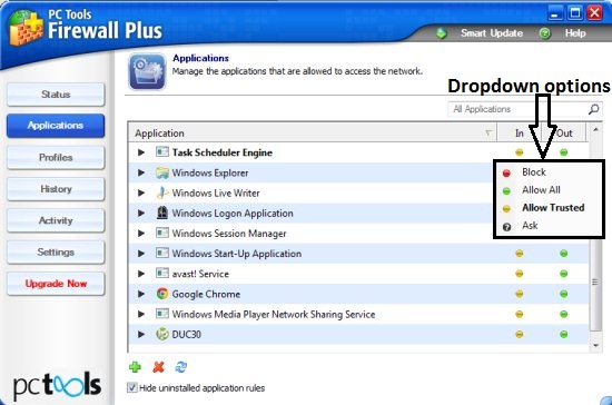 2. Applications: In this applications option you can control both In and Out connections. When you click on the colored dots next to the application, it shows a drop down menu as shown in below screenshot. In that menu you have the option to Block, Allow All, Allow Trusted, and Ask options.