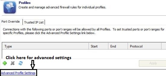 3. Profiles: You have the options for Port Override and Trusted IP List. Port Override option allows port or port ranges that are added to the list. Trusted IP list mean it allows IP addresses or ranges that are added to the list. To add port override and trusted IP list just click on the advanced profile settings.