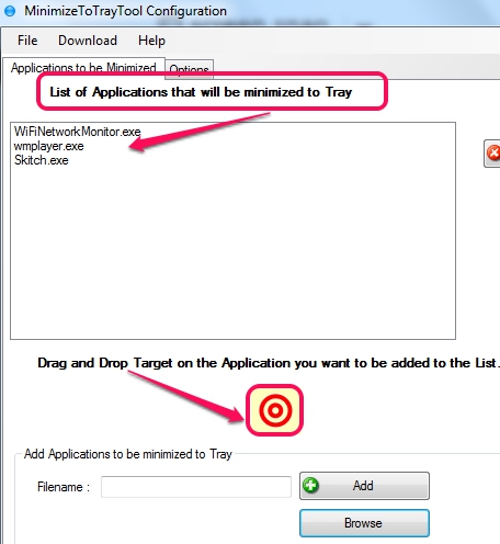 Doing so will open Configure window of this software. Tray icon is also useful to quickly minimize/maximize all the running applications. But if you want to minimize only few applications of your choice, then Configure window is helpful. On configure window, you can use a Target icon to drop on an executable application file to add that application on minimize list. Shortcuts of applications cannot be added, so you have to add applications only from their source location. Browse button can also be used to add applications, but Target icon is helpful to quickly add items.