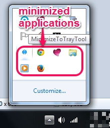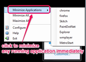 This software is able to minimize either all the running applications or only some custom applications (*.exe) added by user. Screenshot below shows minimized applications icons, that are minimized by this software.