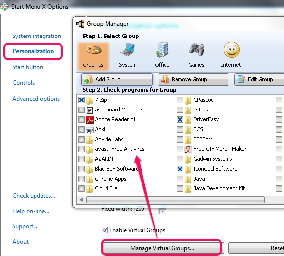 - access personalization option that allows to enable/disable virtual groups. Moreover, you can also manage virtual groups that lets you add/remove programs for virtual groups. But as I mentioned earlier, you won’t be able to add, edit, or remove groups using this free version.