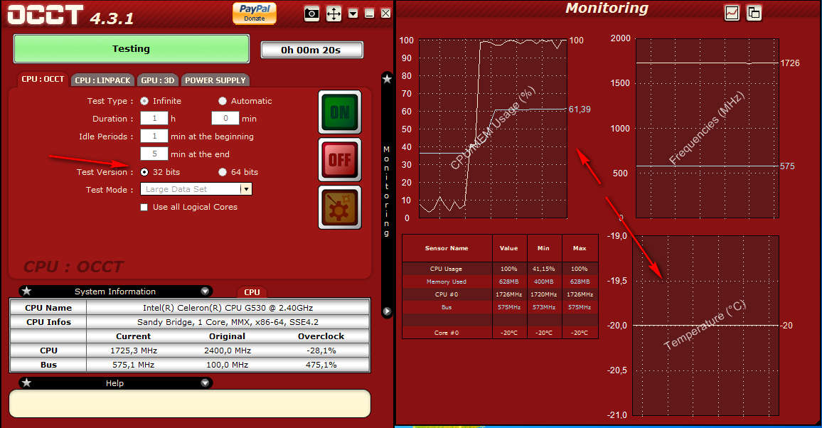 Select the test duration, pick the system type, 32bit or 64bit, modes of work, which is the type of data sets that are gonna be testing your system, and then click ON. After that use the monitoring window on the right to see that the CPU is fully loaded and is being tested. Make sure to track the temperature, so that it doesn’t go up too much, but there are alarms for that, like we said.