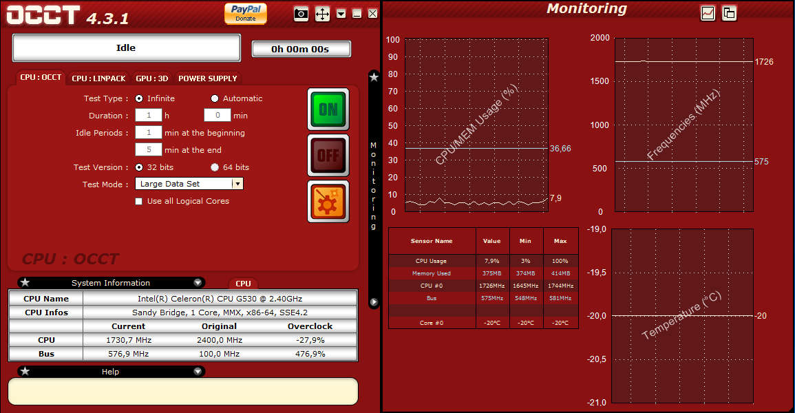 Interface of OCCT can be seen on the screenshot above. It consists of two parts, as you can see on the left we have the main control panel where you can start tests and read various different system information, while on the right we have to monitoring window where you can check to see the processor and memory usage as well as voltages and temperatures of various different components.