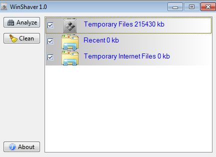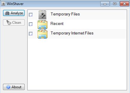 Simple would be the best word to describe the interface of this free portable junk removal software. There’s three different system areas that are gonna be scanned by WinShaver, temporary files, recent files and temporary internet files. Left sidebar only has three buttons, the two in the top left corner being the most important ones that you’re gonna need.
