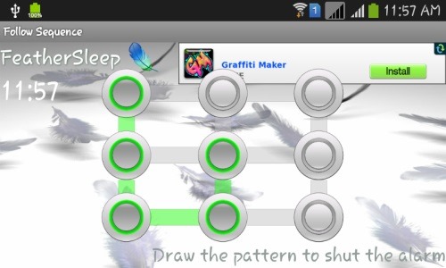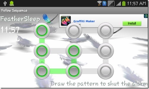 As soon as the alarm rings, the app will draw a pattern on the screen. It will then erase the patterns. Then you will need to draw the same pattern. Only if you are able to draw the correct pattern, you will be able to dismiss the alarm.