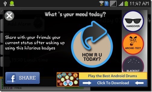 Once your alarm is dismissed, it offers you many funny badghes, that you can use to share your mood with your Facebook friends.